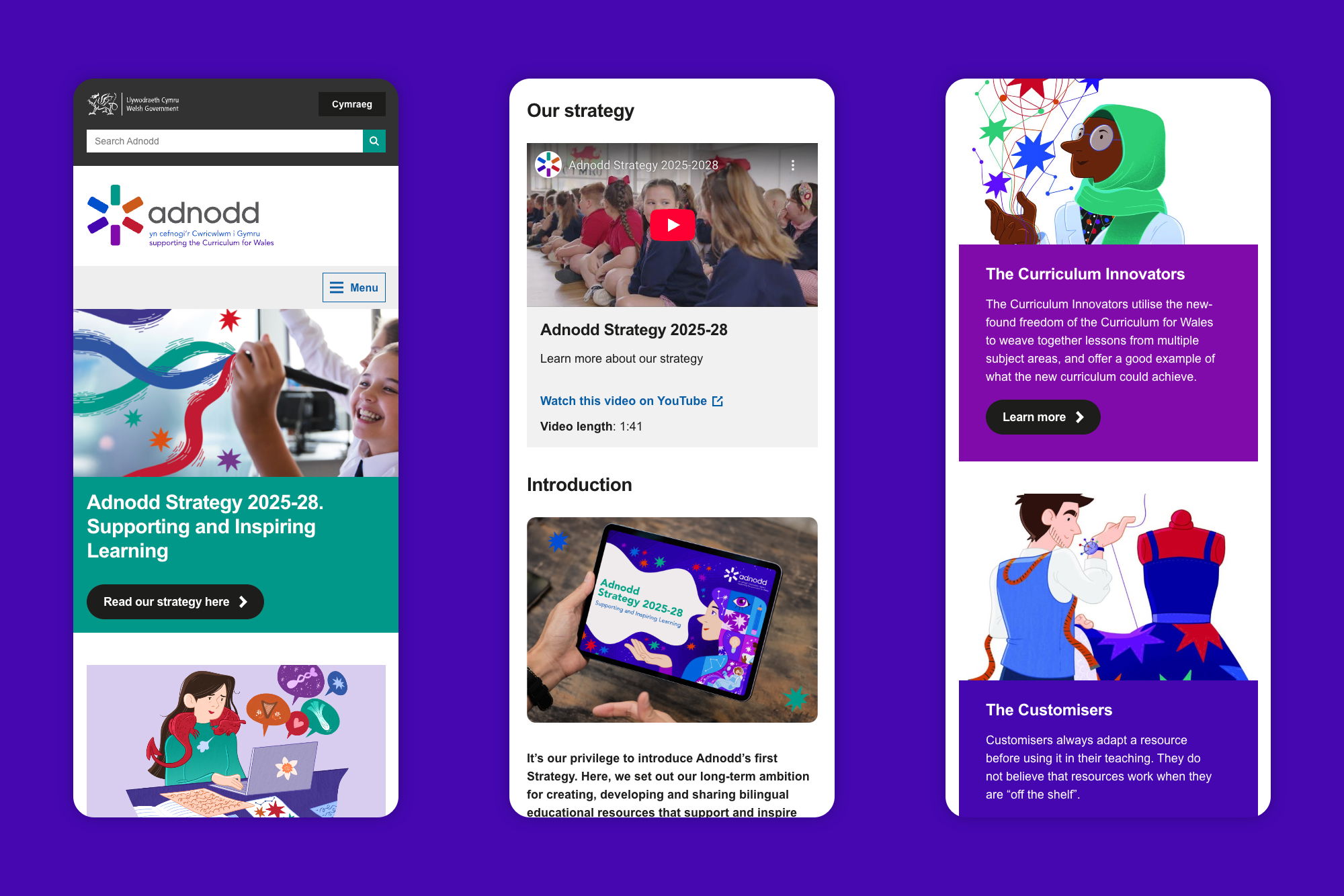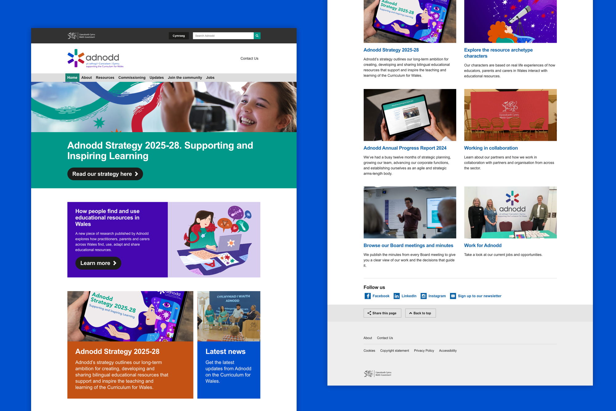 We designed and built a central hub where people can discover Adnodd’s role, explore its strategy and access resources that support the Curriculum for Wales. The website provides clear pathways for educators, publishers and partners to get involved – turning vision into something people can use and act on.
