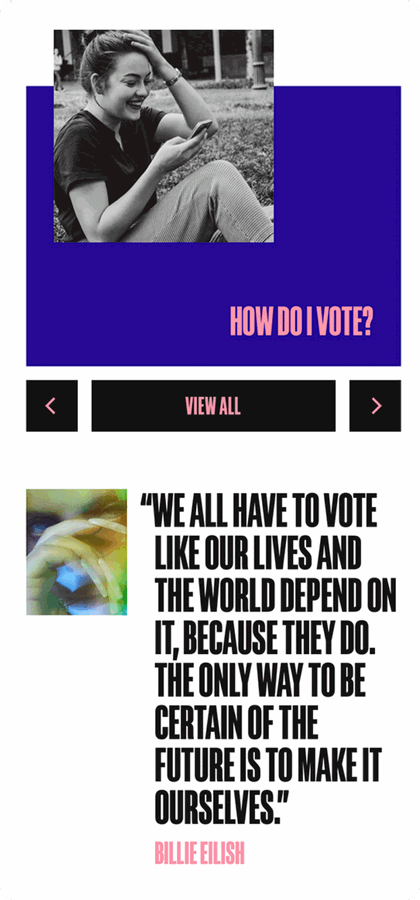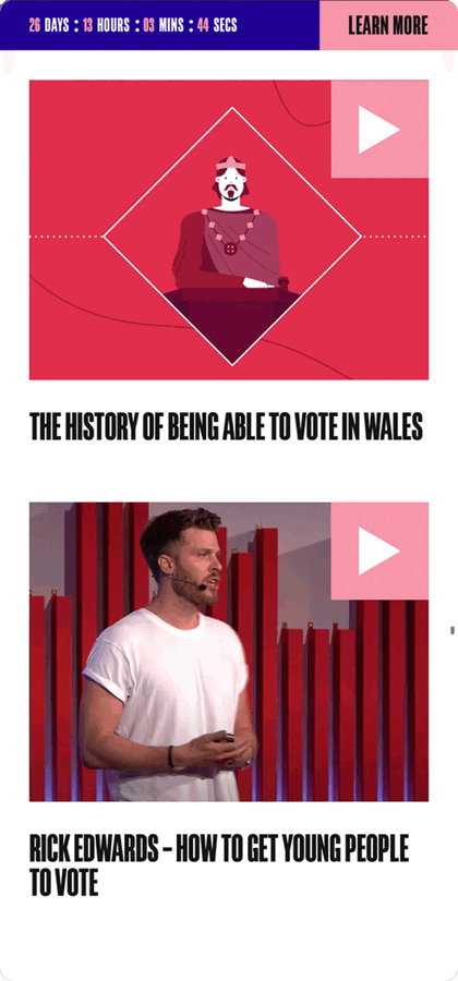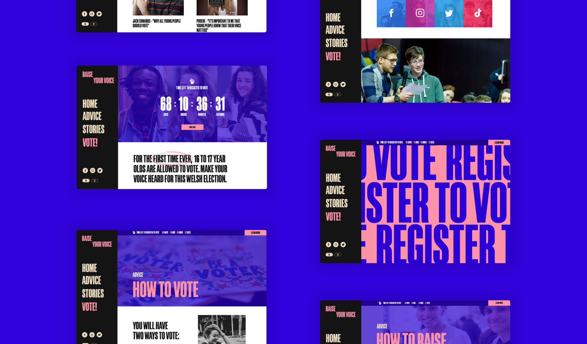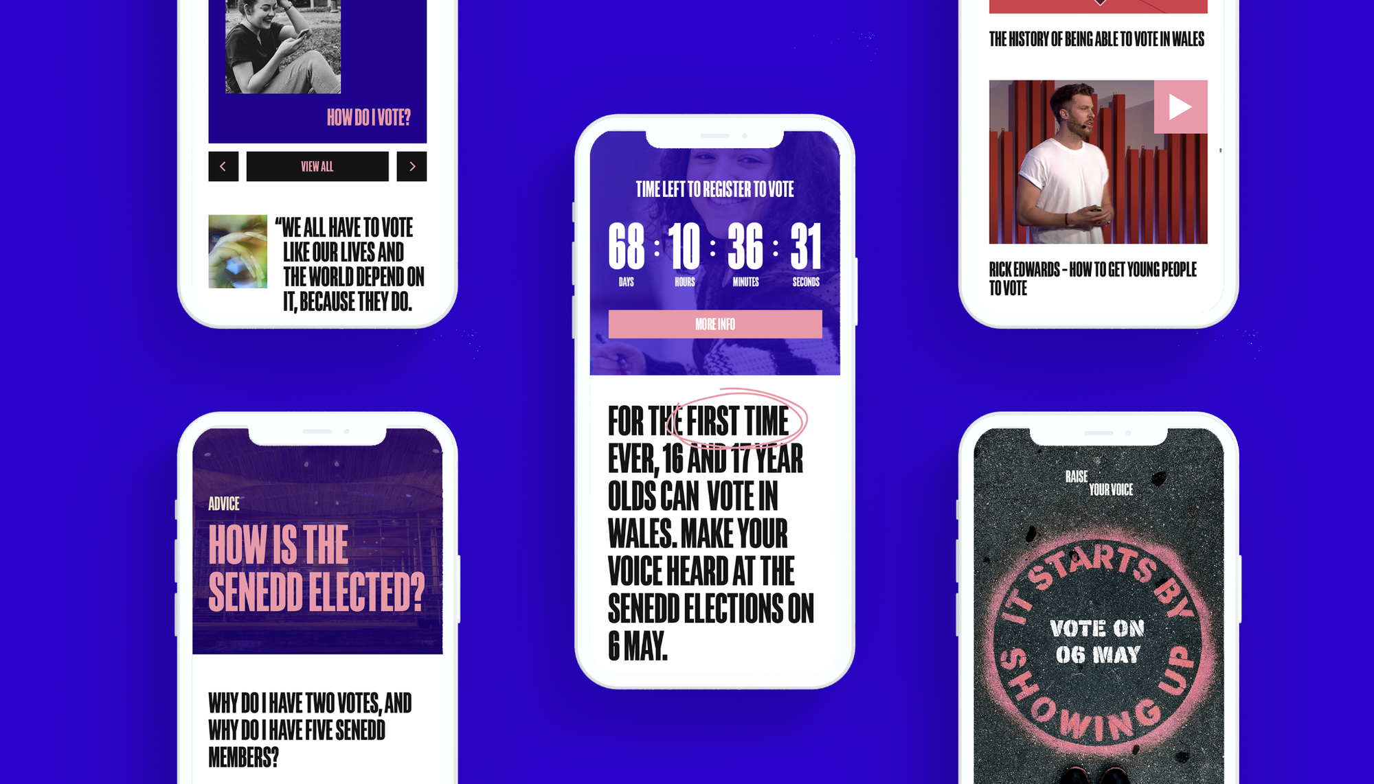 We created a bilingual microsite that educated young people on how to register and vote, counted down to key milestones, and encouraged them to take action. Clear calls like ‘use your voice’ and ‘vote’ were at the centre of the site.
